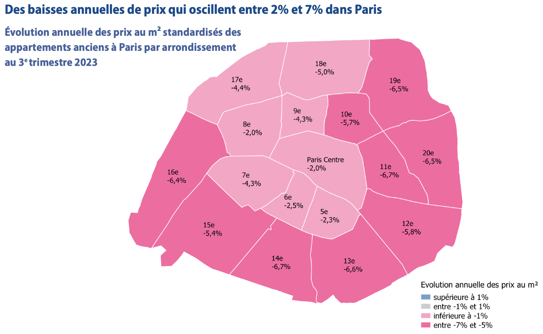 So what is this decrease in affordability doing to pricing? As we can see, prices have adjusted downwards in every arrondissement in the city. The degree to which prices have adjusted is not uniform, however, as the central arrondissements of the 1st through the 6th and the 8th have lost between -2% and -2.5% in value whereas the peripheral arrondissements have lost between -4.4% and -6.7%.