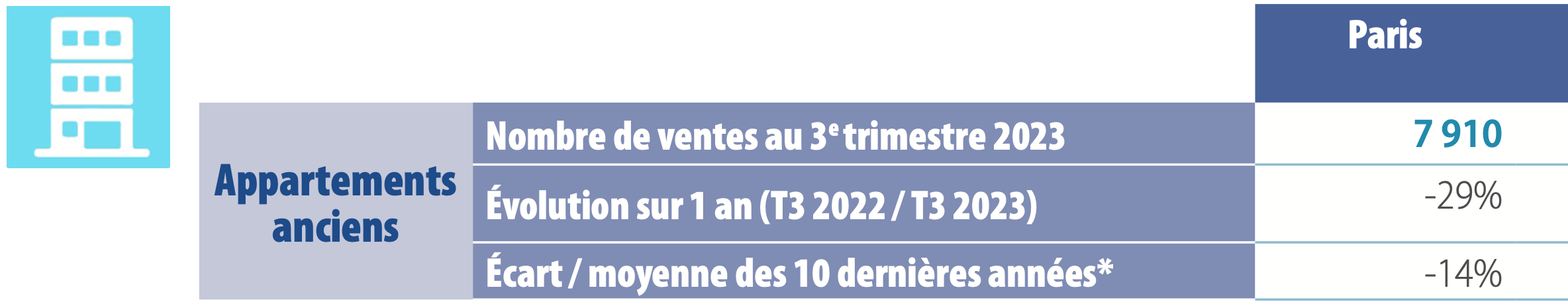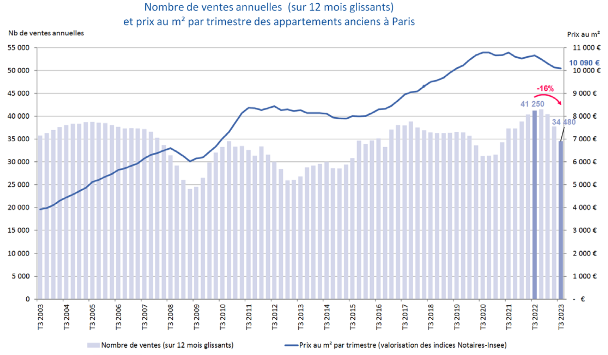 The number of closed transactions 12-months-running in Paris dipped -16% compared to the year prior, adjusting from 41,250 to 34,480 units. The number of closed transactions during the 3rd quarter in Paris was 7,910, down -29% from the year prior and -14% below the 10-year historical average.