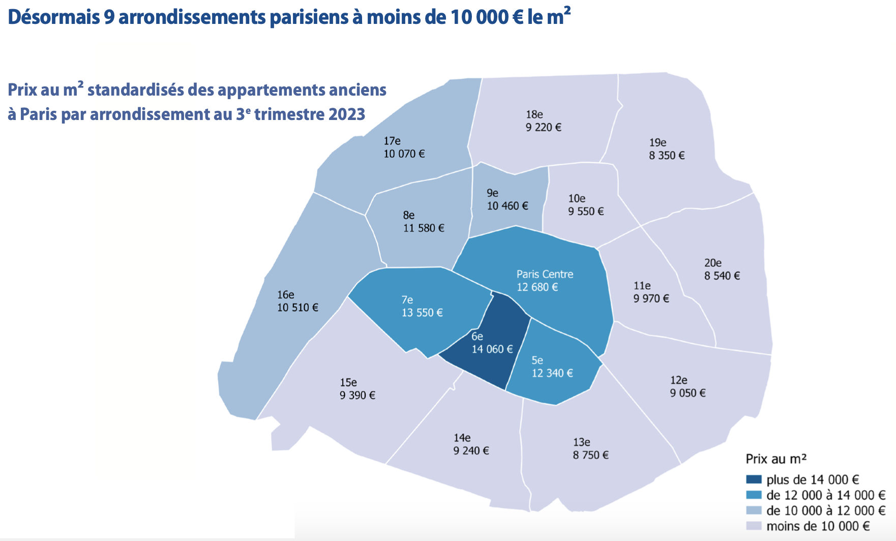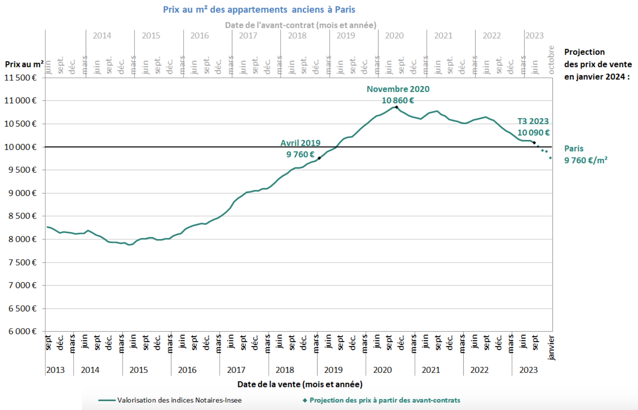 Where do the Notaires see the market heading? Based on the information captured from the “pre-contracts” or “compromis de vente”, prices are set to continue their adjustment downward to attempt to bridge the affordability gap buyers are currently facing. As soon as next month, the Paris real estate market as a whole could see the average price per square meter drop below the 10,000 € mark.