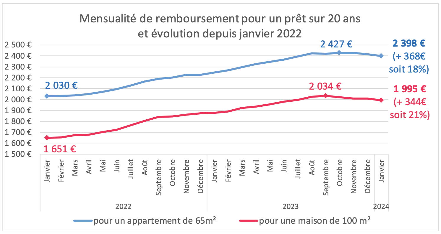 When we look at the impact on the average monthly payment that the rise in mortgage rates has created, a person who buys an average 65 square meter (700 square feet) apartment in Paris today will be paying 2,398 €, 18% more than they would be paying had they bought the same apartment in January of 2022 when interest rates for home loans were roughly four times less than what they are today.