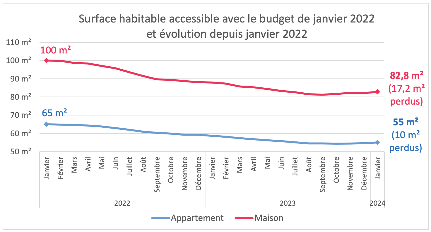 What you see in the graph above is that an apartment buyer in Paris who could have afforded 65 square meters in January of 2022 can now afford 55 square meters when keeping their monthly payment the same. That’s a decrease of -15.3%.